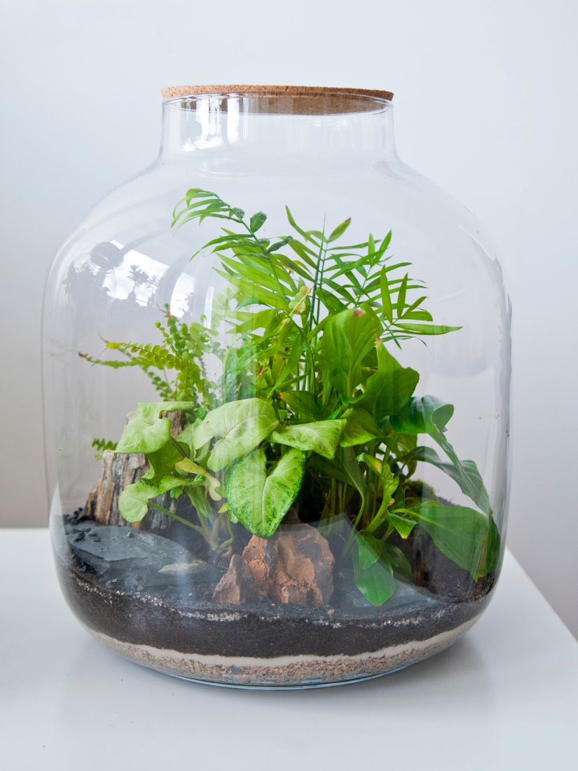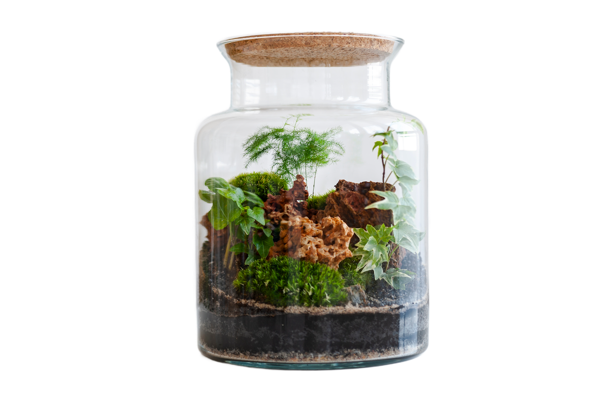 Discover the Kantō Glass Terrarium: A chic cylindrical design, 6-7 inches in diameter and 8-10 inches tall, it flourishes with lively ferns, small parlor palms, Pileas, or arrowhead plants. It is enhanced with natural-colored sand fillers and black/grey stones for a touch of sophistication. The unique lid adds a distinctive finish.